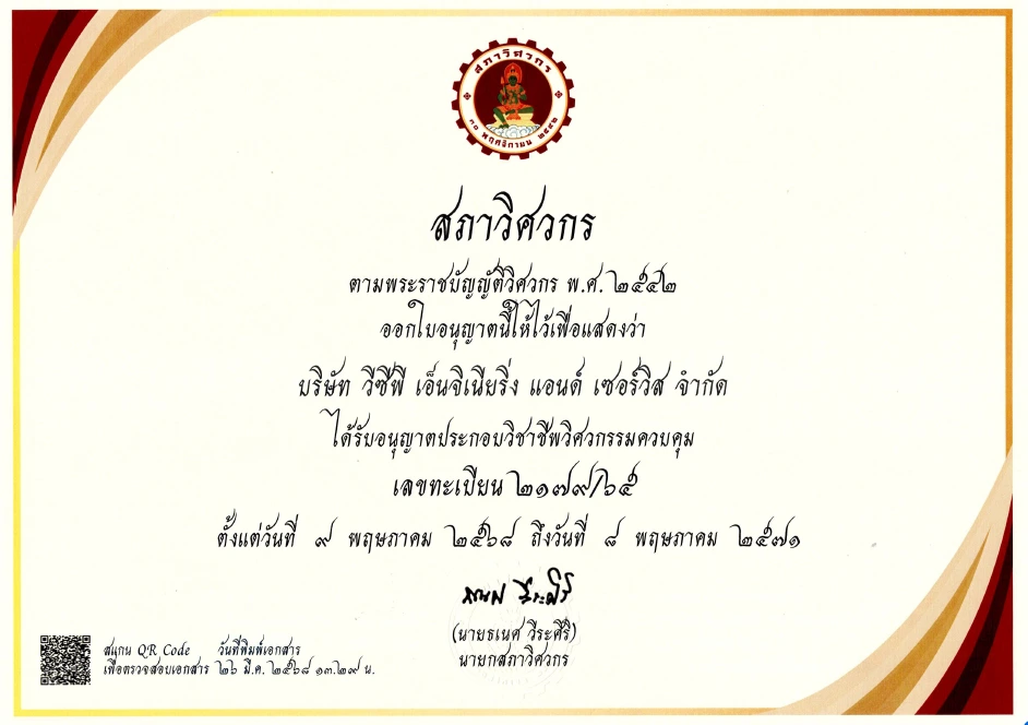 บริษัทฯ ได้รับการรับรองจากสภาวิศวกรและหน่วยงานราชการอย่างถูกต้อง